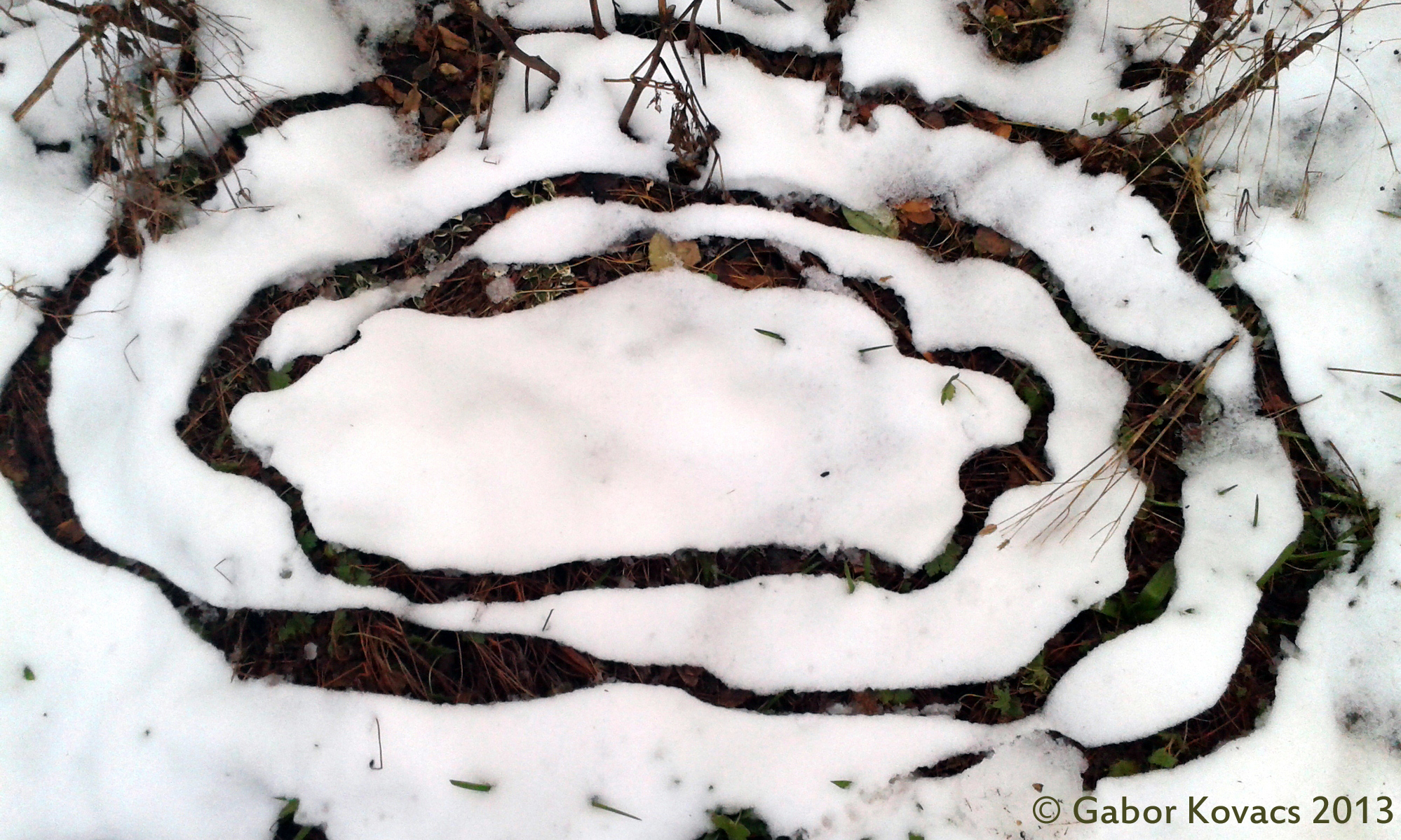 I saw this spiral pattern in the snow in one of our flowerbeds this morning. Definitely not man-made. It has been suggested it may be the work of a slug.