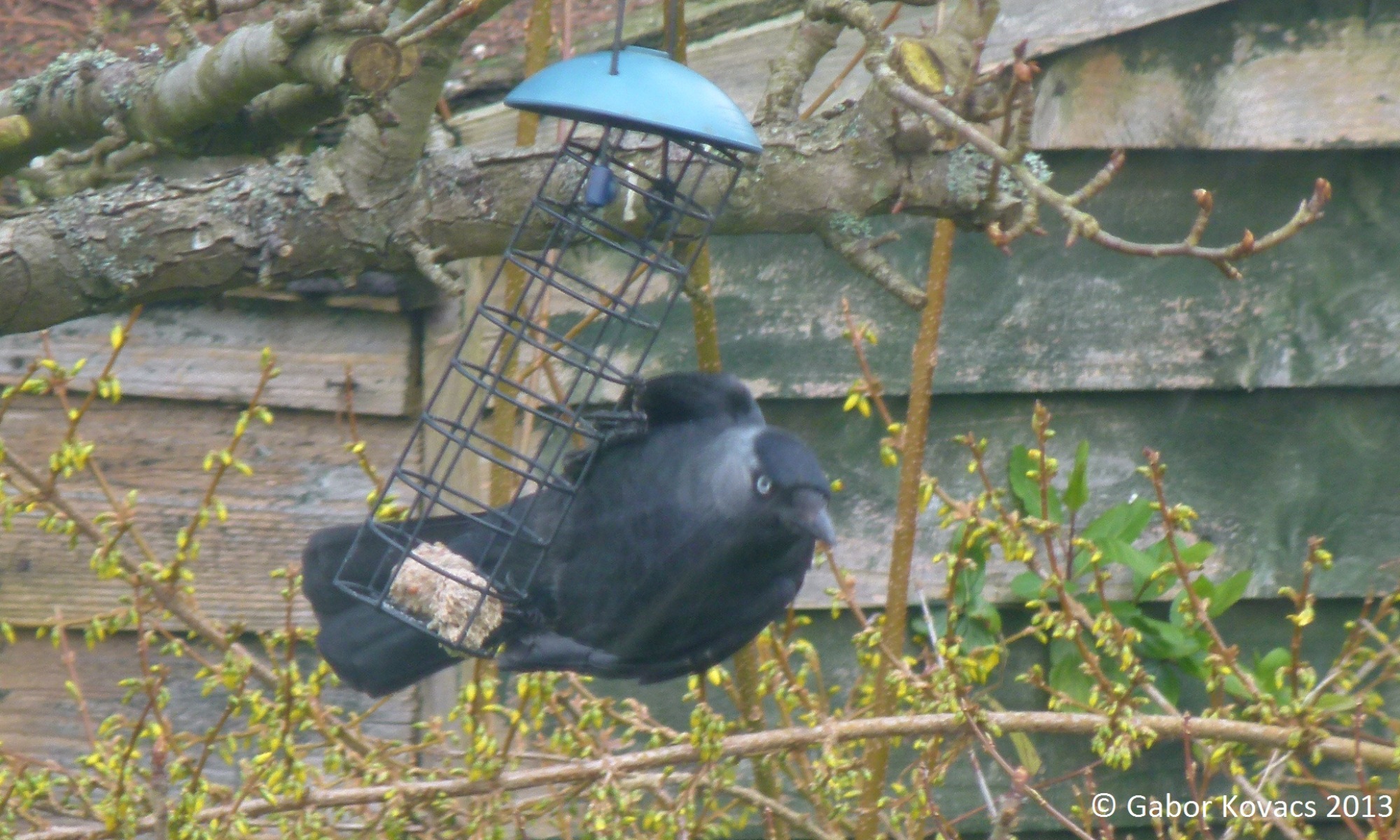 I saw this jackdaw this morning, on the bird feeder in our pear tree. It shows what a hard winter it has been for the birds.