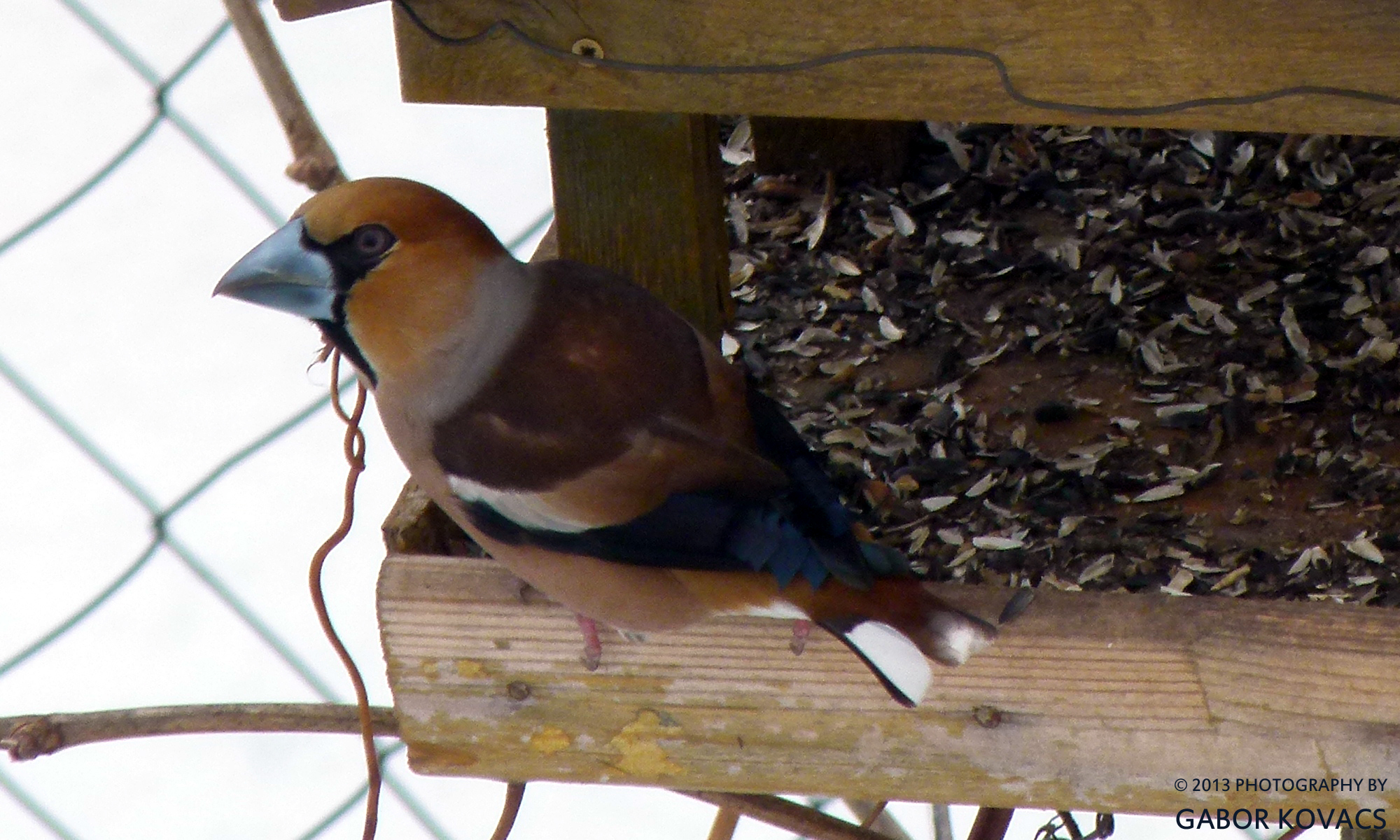 A hawfinch, as I now know, on a garden feeder in Piliscsaba, near Budapest, Hungary on 30 March 2013.