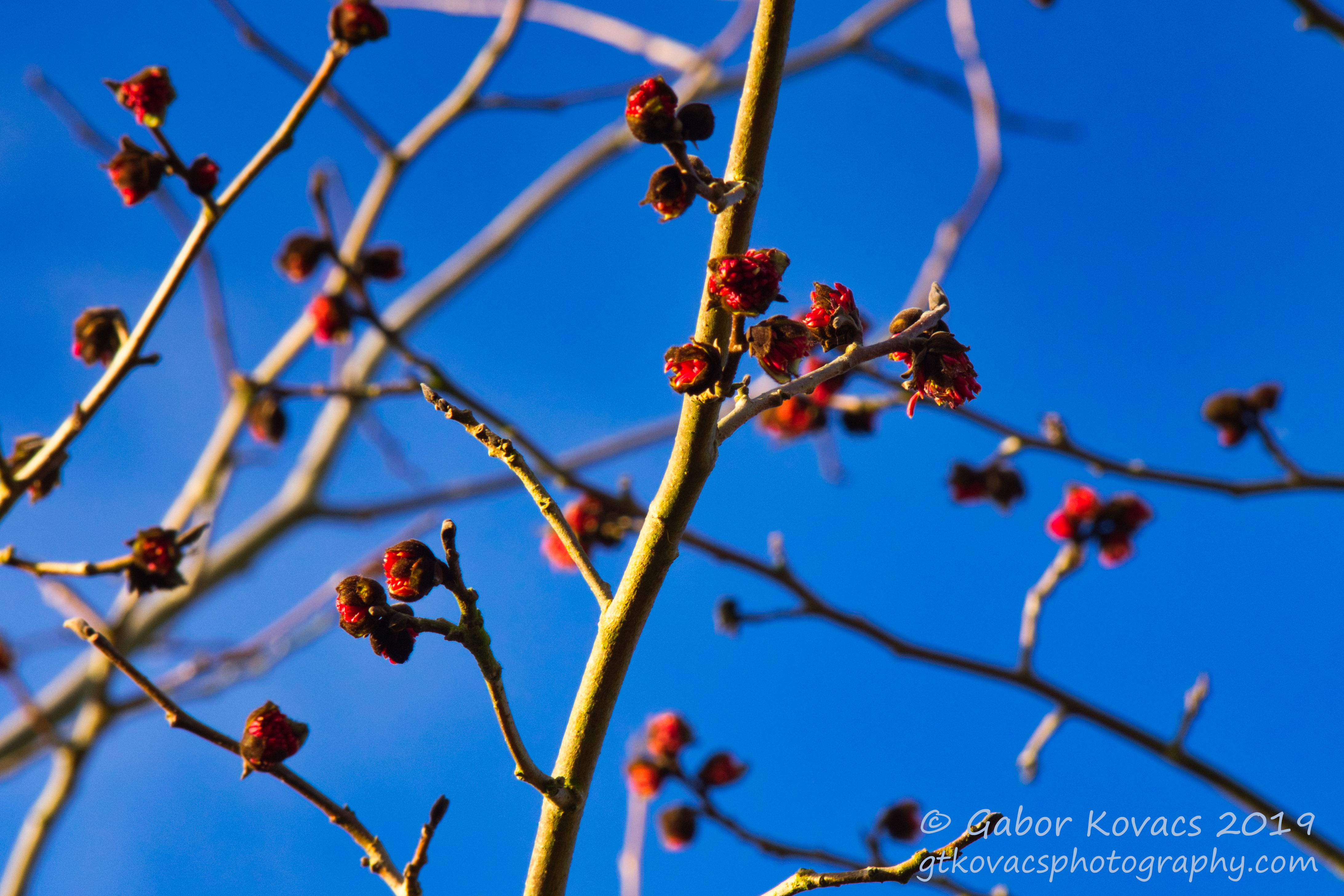 Our Persian Ironwood (Parrotia Persica) is always the first in flower. Tiny little red flowers that are easy to miss. This morning they were glowing in the sunshine.