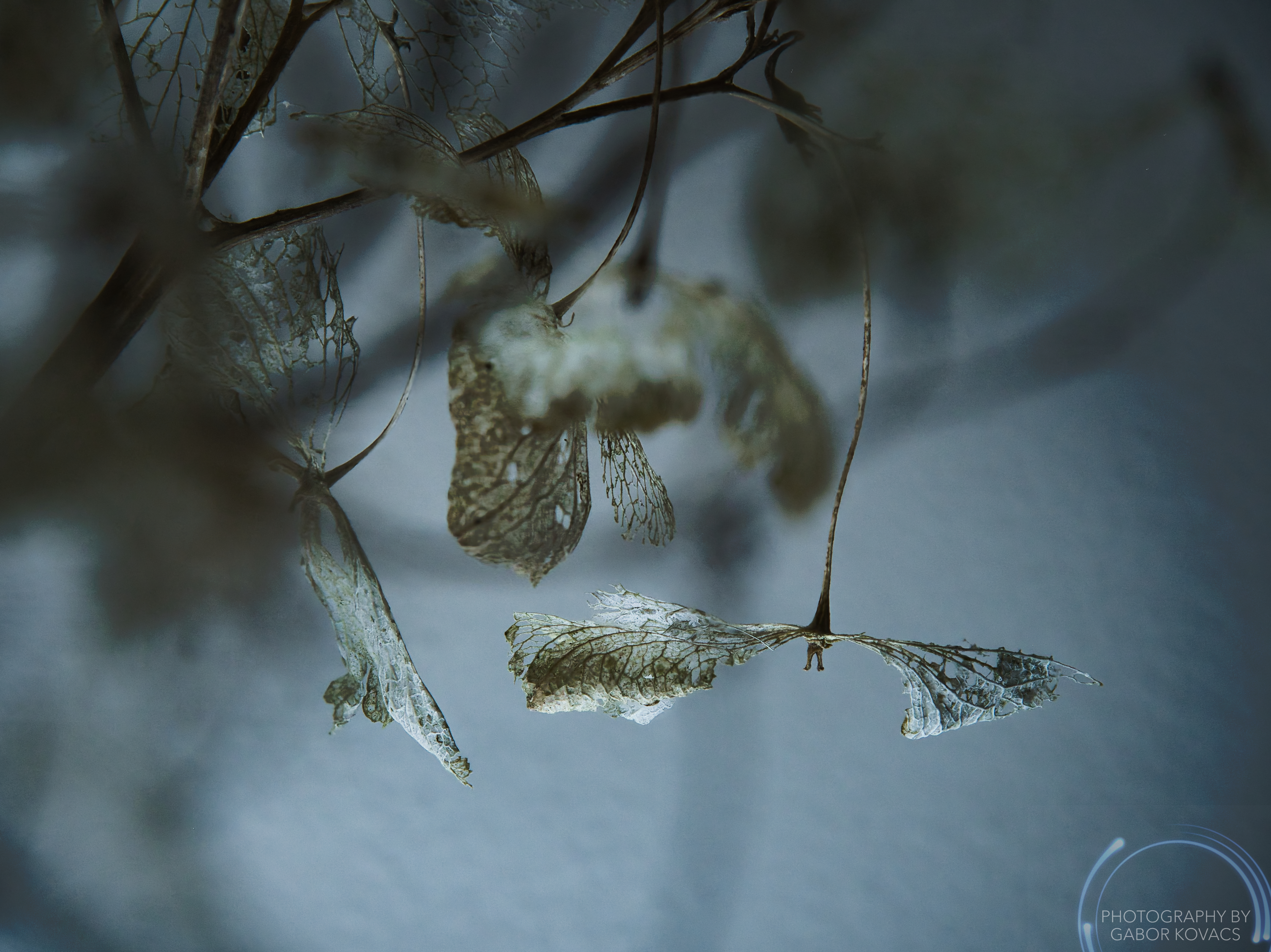 The way that hydrangea flowers decay to show just their veins seems perfect for this week’s challenge. I sat a small vase on a lightbox to take this image – well, 15 stacked images. I then blended the result with a black and white layer set at 30% opacity.