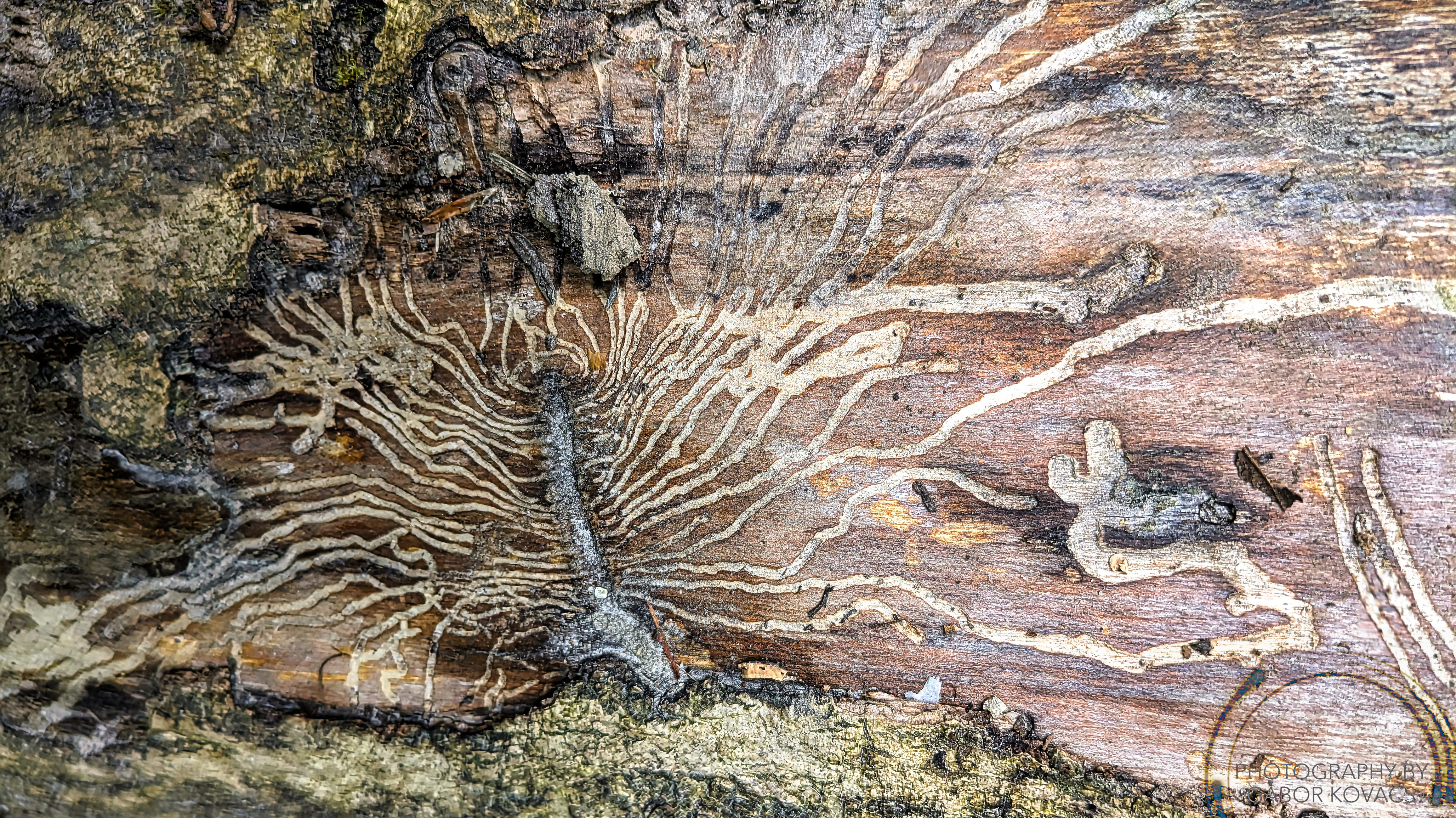 I am struggling to choose a title for this one! It is the pattern made by insect larvae in a fallen tree trunk. Presumably the action all took place under the layer of bark that has since come away.